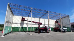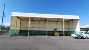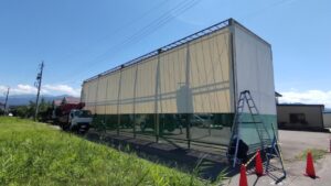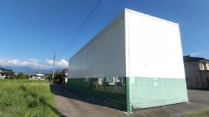 長野市村山でテント倉庫の屋根・壁シートが突風で剥がれてしまいシート張替えをしました。